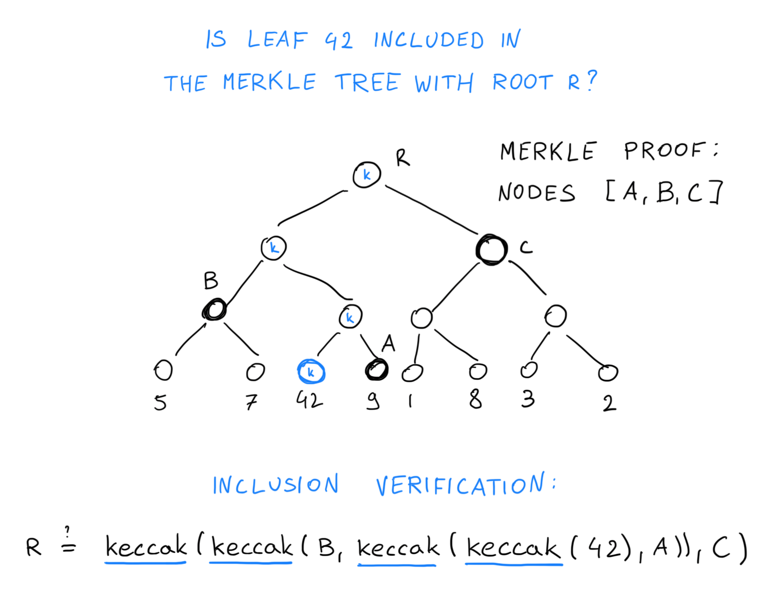 A merkle tree of depth 4 requires calculating 4 Keccak hashes (nodes marked “k”) to verify a merkle inclusion proof (A, B, C) for a specific leaf (42).
