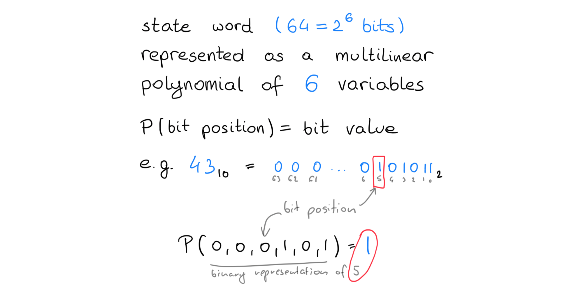 We can think of 64 bit words as polynomials of 6 variables. For boolean inputs, these variables represent bit position within the word, and the evaluated value is the bit value at that position.