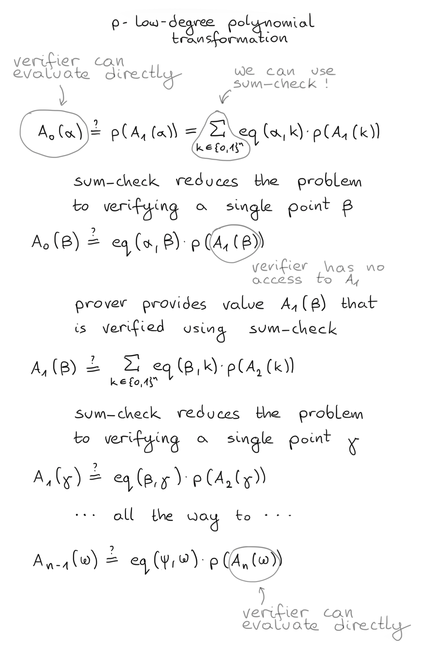 We still need to figure out what to do with \(2^6\) terms under the sum. Luckily, the sum-check protocol allows us to provide the verifier with a sum of all boolean evaluations of a polynomial (evaluations for all bits of our state), and prove that said sum is correct without the verifier needing to re-do the work. It does this by reducing the verification of that sum to the verification of one polynomial evaluated at a random point.